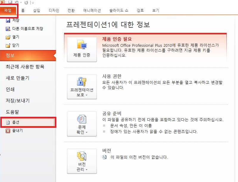 1. 파워포인트 좌측 상단에 파일 - 옵션으로 들어가줍니다.