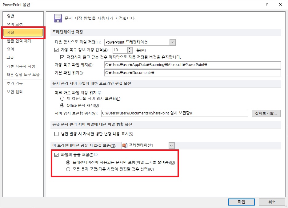 사전에 준비해야 할 2가지 방법 중 한 가지는 바로 글꼴 포함 저장입니다.